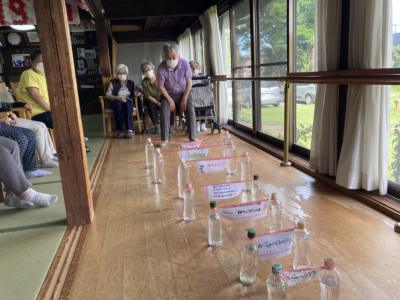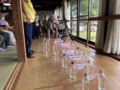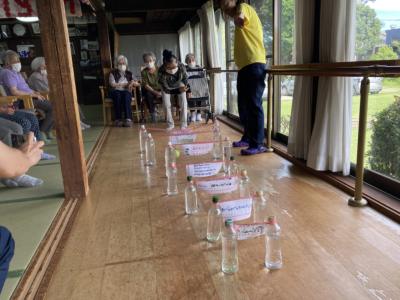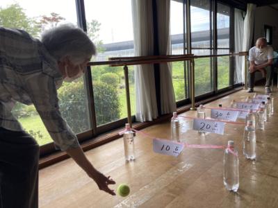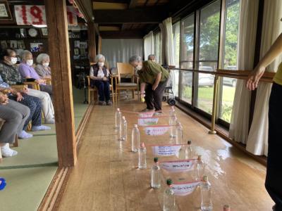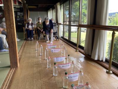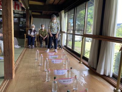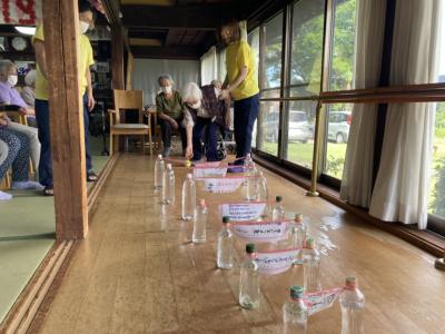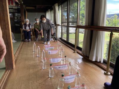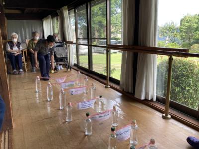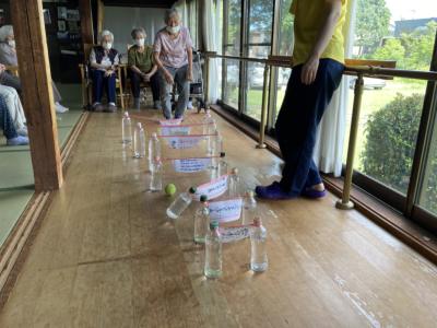ボールを転がし、並べたペットボトルの下を潜らせる
