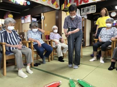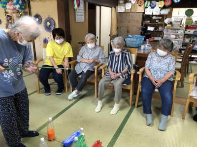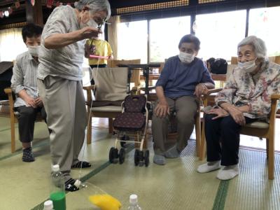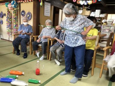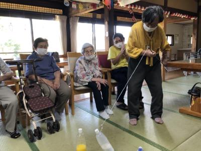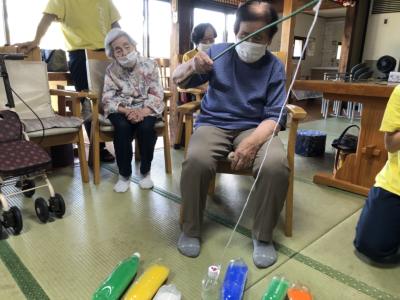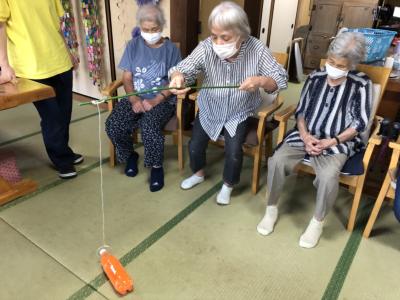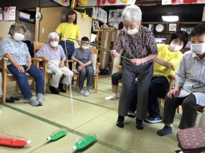 輪っかを吊るした竿をペットボトルの先端に引っ掛けて起こすゲームです