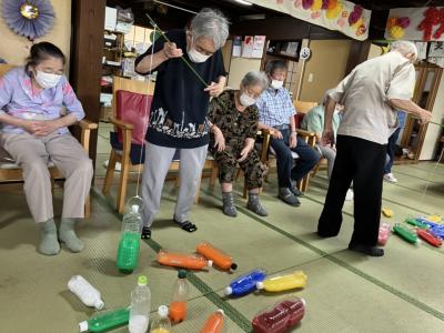 紐の先端についている輪をペットボトルに引っ掛けて起こします