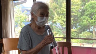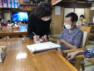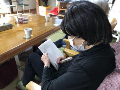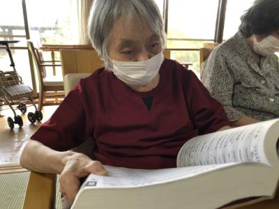 お仲間が歌う歌の曲名を熱心にメモをする母📝