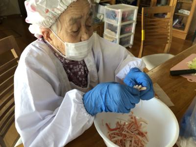 ワカメと和えるカニカマをとっても細かく丁寧にさいてくれました
