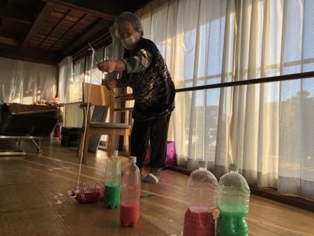 紐の先に輪っかを結んだ棒を使って、倒れているペットボトルを起こします