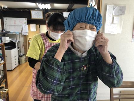 割烹着やエプロンを着用し、帽子をかぶり手袋を装着指でOK