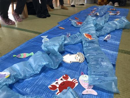 水に見立てたブルーシートの上にお魚を放流しま~~す