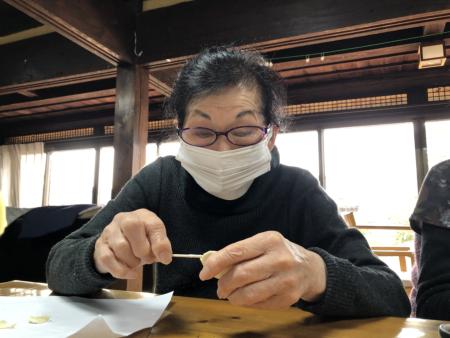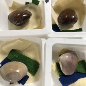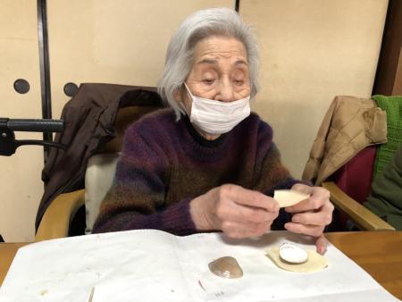 布を張り付けたハマグリをジィ~~っと見つめる母です