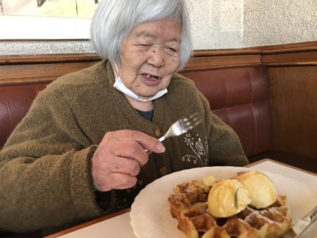 ワッフルに乗ったアイスクリームを見てとっても嬉しそうな母
