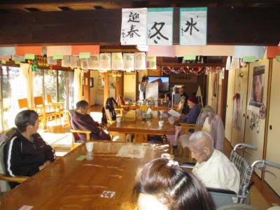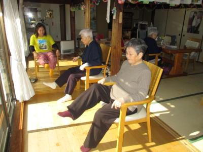 ポカポカの縁側で機能訓練に取り組みます![]()