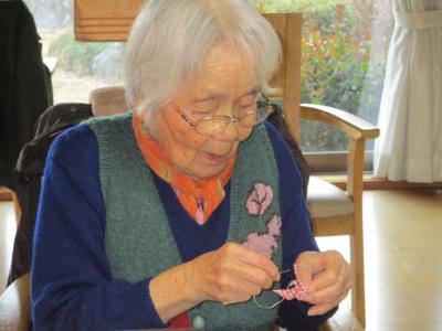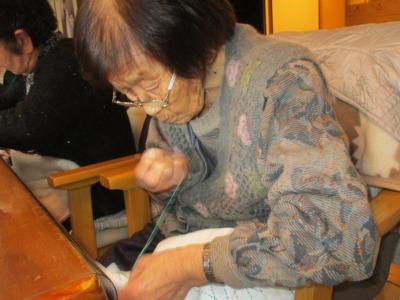 刺し子で布巾作りのお母さん![]()