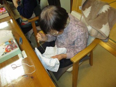 刺し子で布巾作りのお母さん![]()