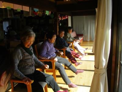 ポカポカの縁側では機能訓練を頑張る母達の姿があります。