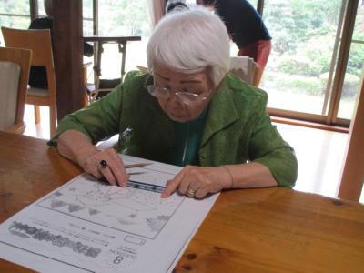 数字塗り絵に取り組むお母さん、先ずは1番の番号の緑色からスタートです!