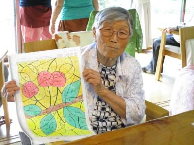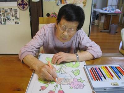バラの塗り絵では、幸望庵のお庭に咲き誇るバラを思い出しながら、優雅な気持ちで塗られています。 今にも香って来そうですね