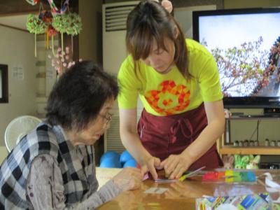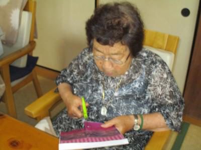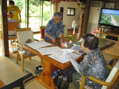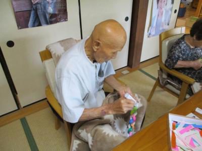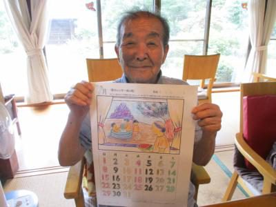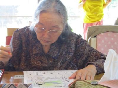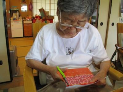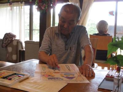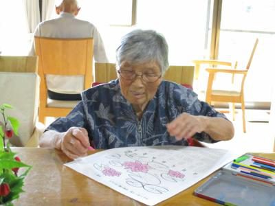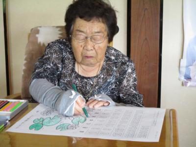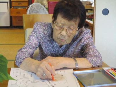 暑中見舞いの塗り絵カレンダーに取り組まれているお母さん。