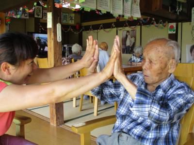 機能訓練が終った後のハイタッチ