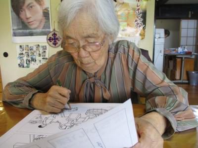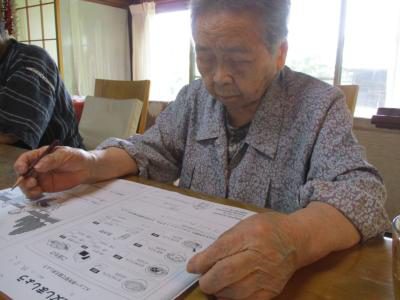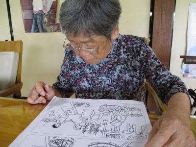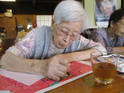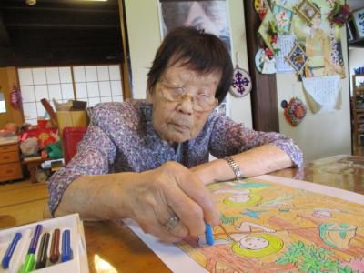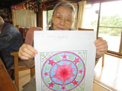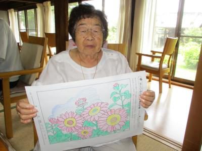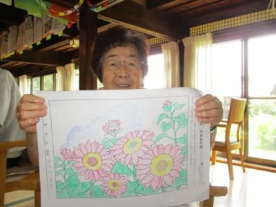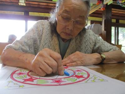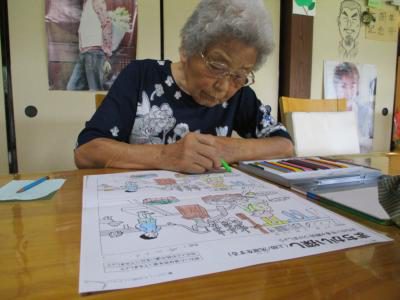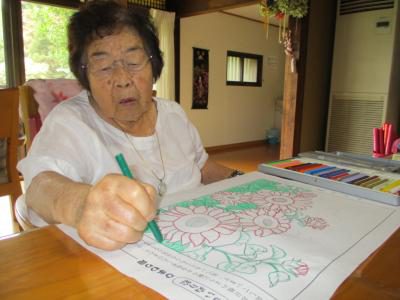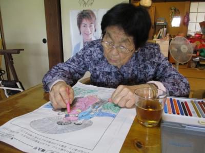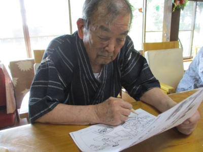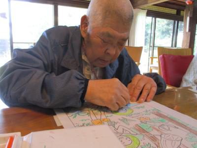 虫取りの塗り絵に取り組むお母さん、細部まで丁寧に塗られています。