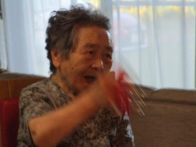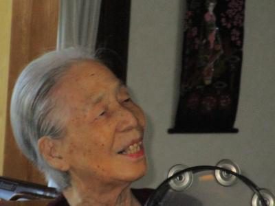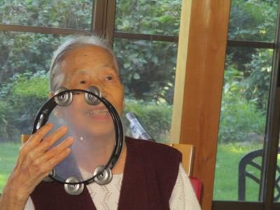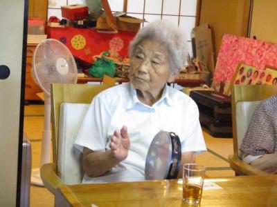 歌い終わると、恥ずかしそうにタンバリンで顔を隠してしまいました