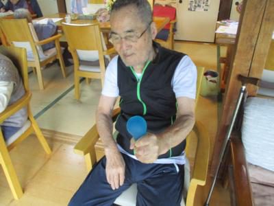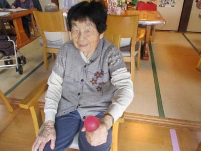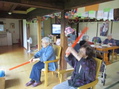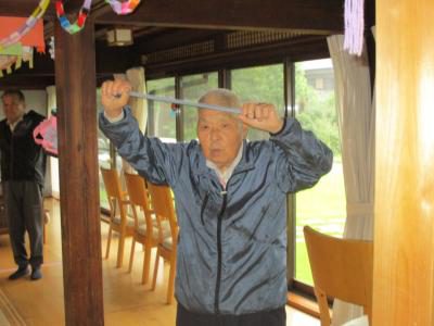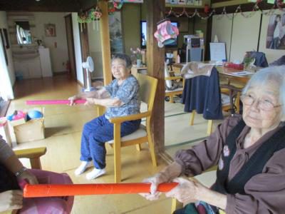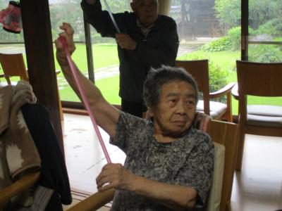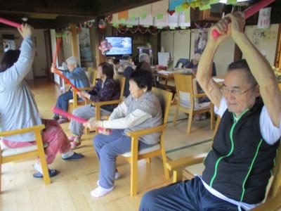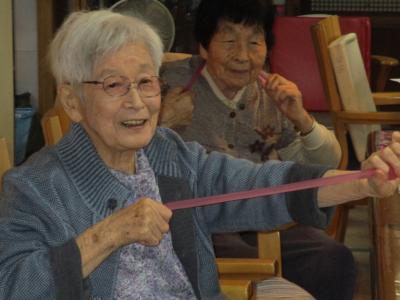 歌謡体操ではゴムバンドを使ってリズムに合わせて身体を動かしました
