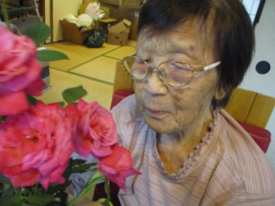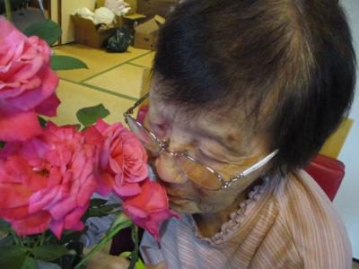 綺麗なバラを見て、すかさずその香りを嗅ごうと顔を近づける母・・・