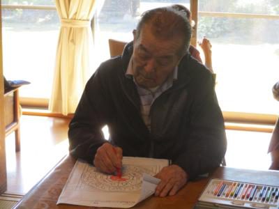 ハロウィンの曼荼羅塗り絵に取り組むお父さん