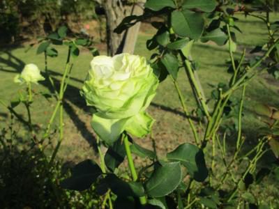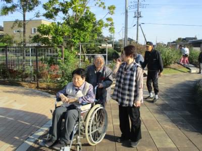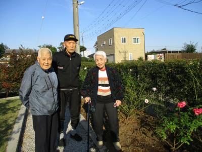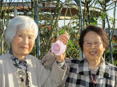 お庭を散策し、枝垂れバラを見つけ香りを嗅ぎながら癒される母達・・・