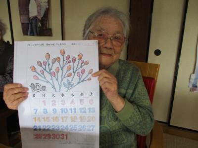 10月の暦の日付部分を色塗りされているお母さん・・・