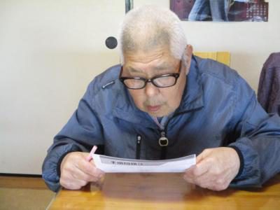 〇埋めパズル計算に取り組むお父さん! 〇の中に+プラスやーマイナスを記入しながら、数が合うよう計算しています。