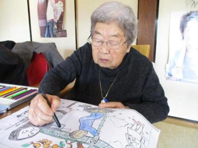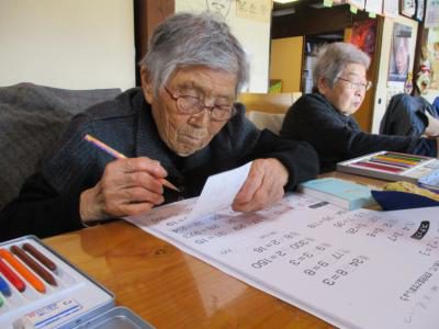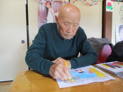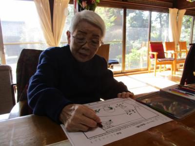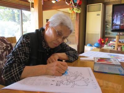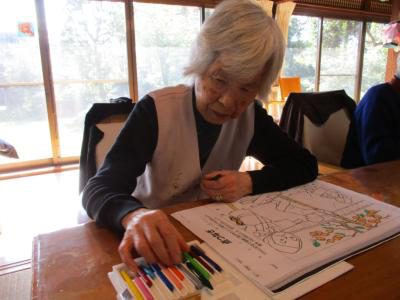 ご自分の好きなお色を選びながら、塗り絵に取り組むお母さん