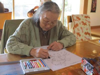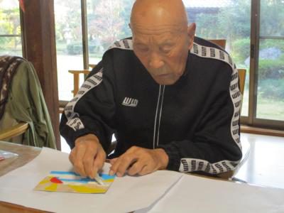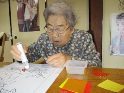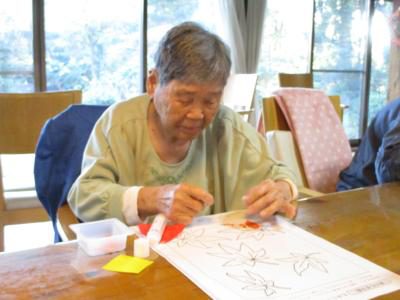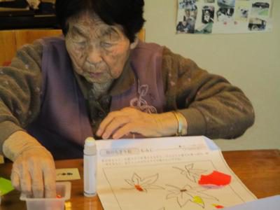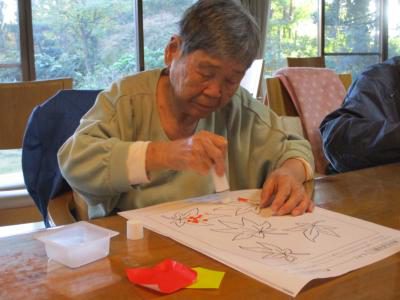 ちぎり絵は、いろ紙を細かくちぎり指先のリハビリ効果抜群です