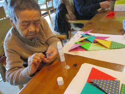部屋に飾る折り紙のクリスマスツリー作りもみんなで協力し合い