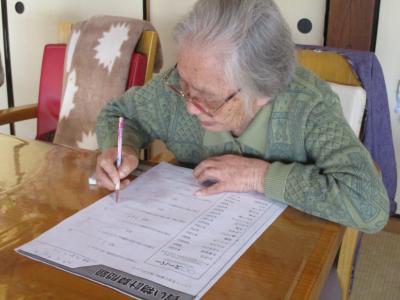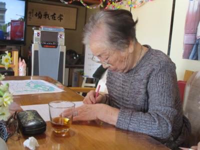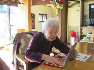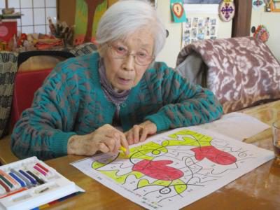 数字塗り絵に取り組むお母さんは、数字毎に指定の色を塗り重ねて行き、なんだか真赤な手袋が出現して来たようですね・・・