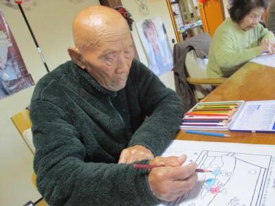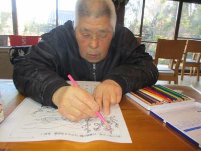 迷わずピンクを取り梅の花を塗るお父さん