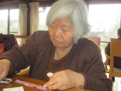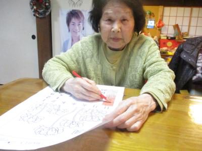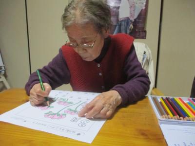 一面のレンゲ畑を思い出されながら、レンゲのお花の色を塗るお母さん。