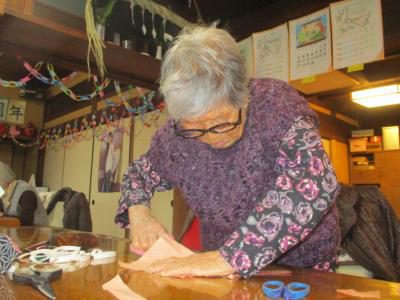 カットした生地を左手に持ちながら、両手を使い作業を進める父・・・