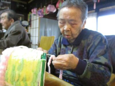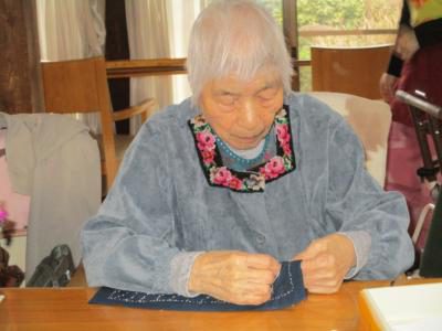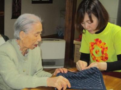 姉妹で交互に刺し子の布巾作り