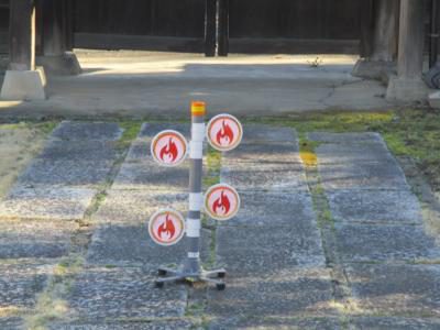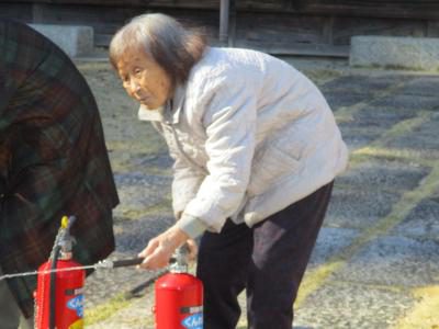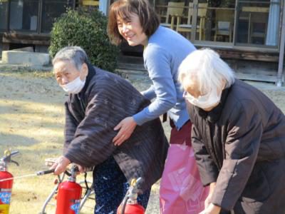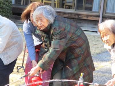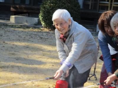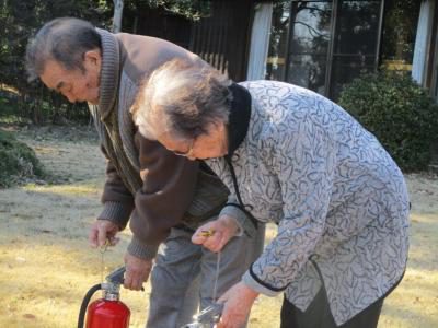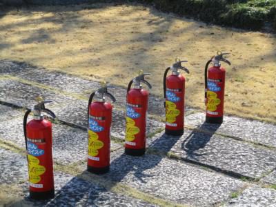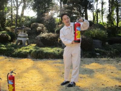 火のマークの的を狙って水消火器の水を放出し消火訓練です