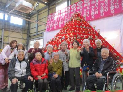 大きなピラミッドひな壇に目を奪われながら、早速 皆さんでお雛様の前で記念撮影