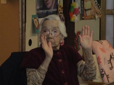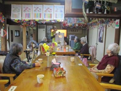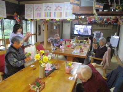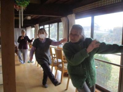 歌謡体操では、立位にて参加され、足を上げ軽やかに身体を動かし体力維持向上グッド (上向き矢印)