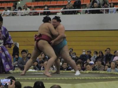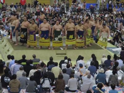 皆さんが着席され、会場中央の土俵に目を向けると、迫力の力士の取り組みに早速目を奪われておりました。