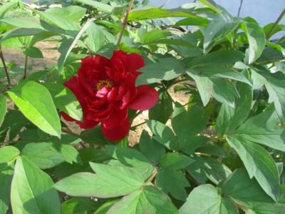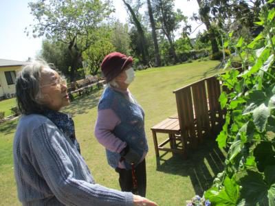 ご自分より背の高い“葵”の花を眺めて驚く母達