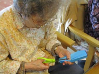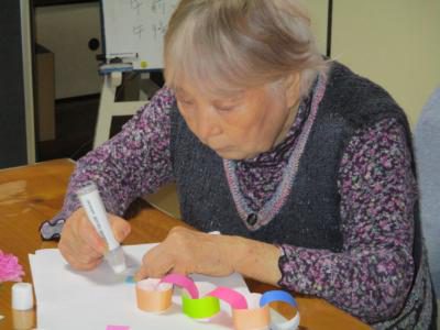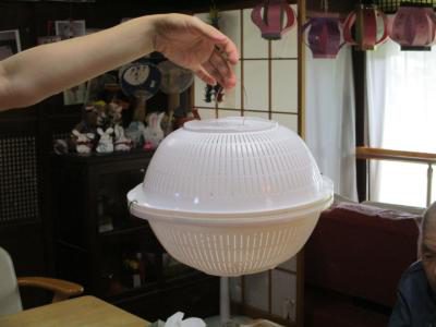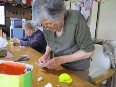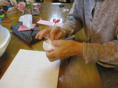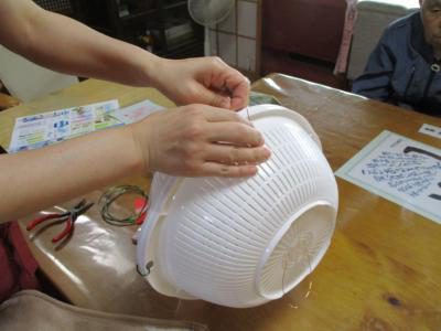 母達に両面テープを貼って頂き、ざるにバランスを見ながら貼っていきます