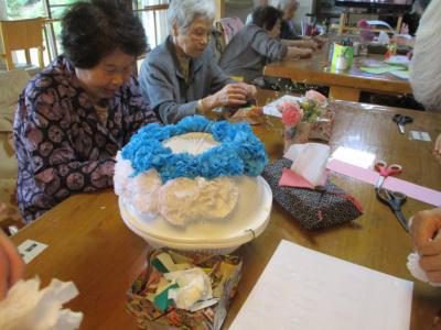 見事に合体したざるに、お花を両面テープで貼っていきます