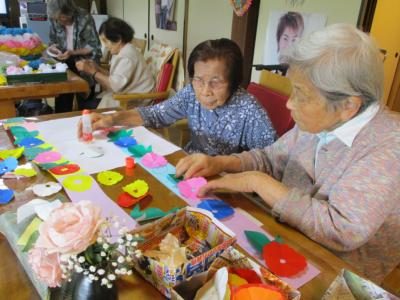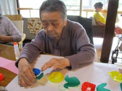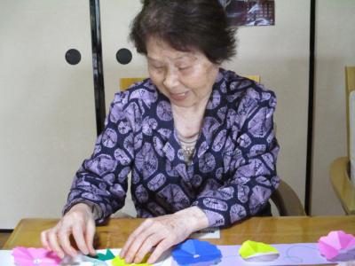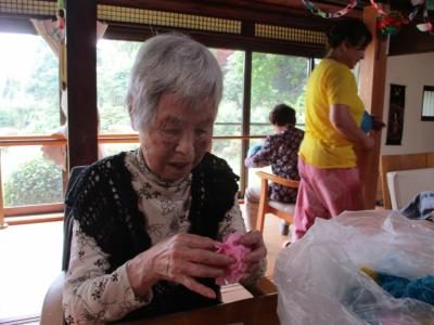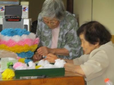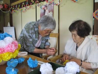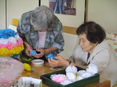 お花紙を蛇腹にして作ったお花を、潰さないように丁寧に扱うお母さん達・・・