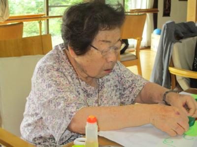 ・・・と仰いながら緑色の折り紙で葉っぱの型取りを行っています。