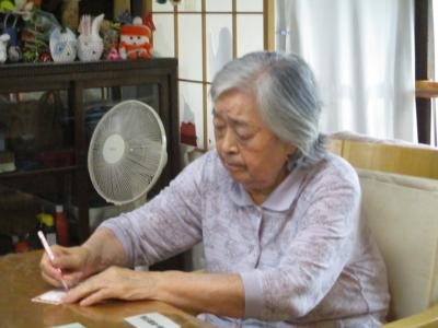 お母さんもハサミを器用に使いながら、短冊をカットー (長音記号1)美容院 (鋏)