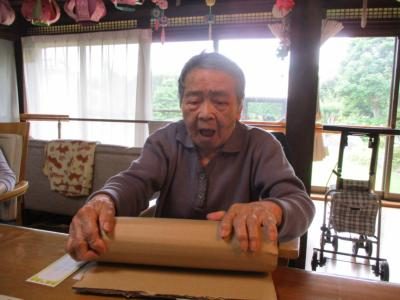お母さんは、採寸されカットした段ボールに筋目を入れ、クルクルと丸めて筒状にして行っています。ー (長音記号2) ー (長音記号2) ー (長音記号2)