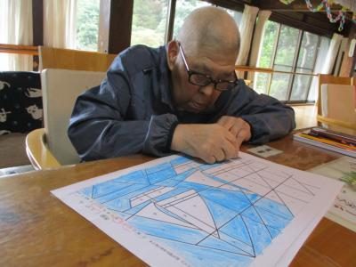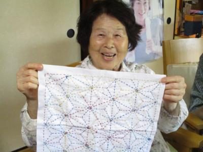 刺し子の布巾が完成した母は、共同作品の壁画作りに