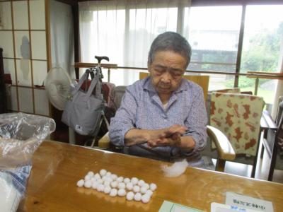 綿を手に取り、まん丸にコロコロクルクル手の平で丸めています台風 台風 台風