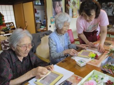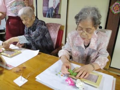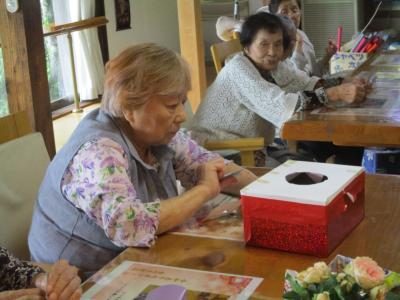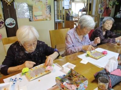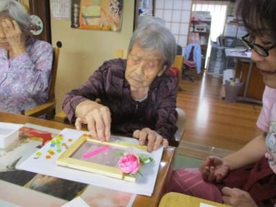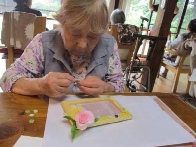花やタイル等を使ってオリジナルの写真立て作りを行いました