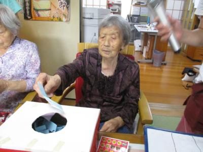 箱の中から引いた数字カードとビンゴカードが合えば穴が開き、