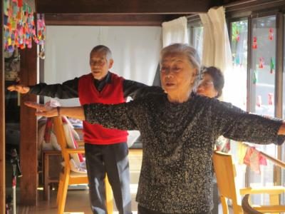 歌謡体操では、ポカポカの縁側に移動されて思い切り手足を伸ばし取り組みます走る人 走る人
